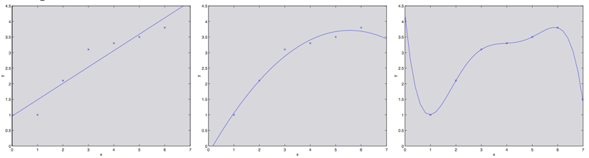 在讲线性回归的时候,我们讨论过这样的问题:拟合数据的时候,选择线性的“\(y = \theta_0 +\theta_1x\)”这样的“简单”模型,还是选择多项式的“\(y= \theta_0 + \theta_1x+ ...+\theta_5x^5\)”这种“复杂”模型。如下图所示: