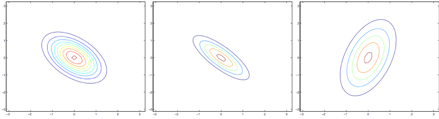 \[ \Sigma =\begin{bmatrix} 1 & 0.5 \\ 0.5 & 1 \\ \end{bmatrix}; \Sigma =\begin{bmatrix} 1 & 0.8 \\ 0.8 & 1 \\ \end{bmatrix} \Sigma =\begin{bmatrix} 3 & 0.8 \\ 0.8 & 1 \\ \end{bmatrix}; \]