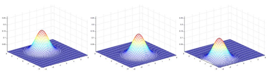 最左边的图,展示的是一个均值为\(0\)(实际上是一个\(2\times 1\) 的零向量)的高斯分布,协方差矩阵就是\(\Sigma = I\) (一个 \(2\times 2\)的单位矩阵,identity matrix)。这种均值为\(0\) 并且协方差矩阵为单位矩阵的高斯分布也叫做标准正态分布。 中间的图中展示的是均值为\(0\)而协方差矩阵是\(0.6I\) 的高斯分布的概率密度函数;最右边的展示的是协方差矩阵\(\Sigma = 2I\)的高斯分布的概率密度函数。从这几个图可以看出,随着协方差矩阵\(\Sigma\)变大,高斯分布的形态就变得更宽平(spread-out),而如果协方差矩阵\(\Sigma\)变小,分布就会更加集中(compressed)。